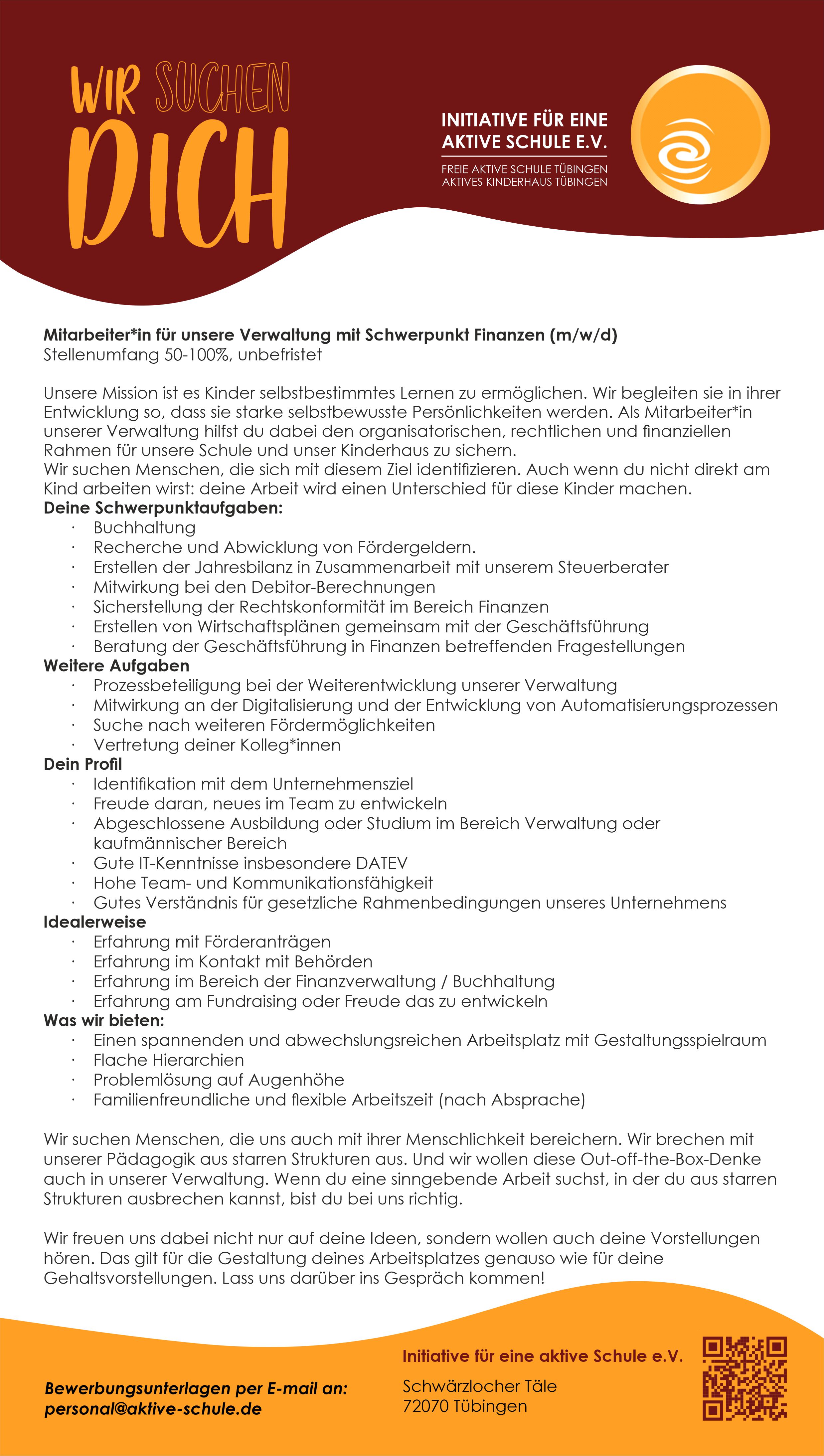 Unsere Mission ist es Kinder selbstbestimmtes Lernen zu ermöglichen. Wir begleiten sie in ihrer Entwicklung so, dass sie starke selbstbewusste Persönlichkeiten werden. Als Mitarbeiter*in unserer Verwaltung hilfst du dabei den organisatorischen, rechtlichen und finanziellen Rahmen für unsere Schule und unser Kinderhaus zu sichern.